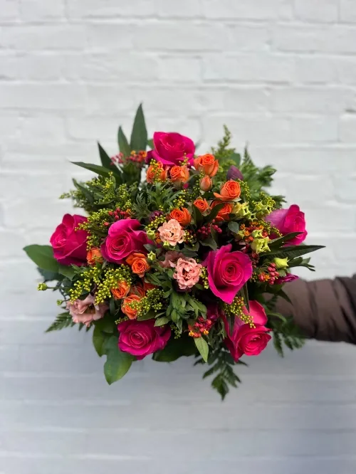 coral zest – orange rose bouquet Coral Zest is the most vivid arrangement in the range. If you want something that reads quietly or elegantly, this isn't it — and that's fine, because some occasions call for something that makes a clear statement from across the room. Orange roses, orange ranunculus, pink tulips, and cerise cymbidium orchids together produce a palette that's warm, energetic, and genuinely tropical in feel. The solidago — golden rod-like filler — adds gold between the main flowers and ties everything together. The aqua roses are the element that stops it from reading as uniformly hot. They bring a slightly cool, distinctive note against all that orange and pink. It's a narrow but meaningful contrast that gives the arrangement visual complexity it wouldn't have otherwise. The flowers Orange roses form the body and set the register. Orange ranunculus echoes the rose colour in a different form — ruffled, compact, layered. Hot pink tulips add height and the same loosening, shifting quality you'd find in Wild Thing — they'll lean and adjust in the vase after delivery, which adds to the arrangement's energy rather than detracting from it. Solidago fills in with fine gold clusters, warm and textural. The cerise cymbidium orchids are the most dramatic element: arching stems with multiple waxy blooms, deep pink, structured, and long-lasting. Aqua roses — a specific named cultivar — sit as the cool counterpoint throughout. The orchids, as with Orchid Opulence and Lime Twist, are the longevity element. The rest of the arrangement will run its course over ten to fourteen days; the cymbidium blooms will likely still be presentable well into the third week. Worth noting if you're sending this for a celebration or event and want the display to persist. Who it's for and when The honest answer is this suits people who actually like bold, vivid flowers — it's not a safe-choice arrangement. If you're buying for someone who would describe a bouquet by its energy and presence first, this is the right direction. For someone who gravitates toward restrained or minimal aesthetics, look at Lime Twist or the white range instead. Birthdays are the most natural fit, particularly significant ones. For a fortieth or fiftieth birthday, an achievement celebration, a graduation, or a promotion, the confidence of the palette suits the occasion better than something understated would. Coral Zest says congratulations without any ambiguity. For housewarming gifts and home décor, it works well in spaces with natural light and enough room to give it presence — a hallway, a kitchen island, a dining table. It would look crowded on a small desk. For corporate gifting, it's a bold choice. The cymbidium orchids give it longevity and quality, and the tropical palette makes an impression. It suits creative industries and celebratory professional occasions better than a formal corporate environment where something more restrained would be more appropriate. Care The mixed vase life of this arrangement means different flowers need different attention. Trim all stems at an angle on arrival, use the flower food sachet, and change the water every couple of days. The tulips will move and shift — normal behaviour, not a problem. The ranunculus keep developing for the first day or two. The orchids need the least attention and will outlast everything else. When the roses and ranunculus start to fade, it's worth cutting the orchid stems fresh and keeping them in a separate vase — they'll carry on for another week or more. Same-day delivery for orders placed before 2pm. Add-ons including chocolates, champagne, and balloons are available at checkout alongside a personal message card. FAQ What flowers are in Coral Zest? Orange roses, Aqua roses, cerise cymbidium orchids, orange ranunculus, pink tulips, and golden solidago. The cymbidium orchids and aqua roses are the most distinctive elements — both less common in standard arrangements, and both contributing something the orange roses alone wouldn't provide. What are Aqua roses? A named rose cultivar that brings a distinctly cool, slightly unusual tone as a contrast against the warm oranges and pinks in this arrangement. They're not tinted or dyed — they're a specific variety selected for their colour and vase performance. In Coral Zest they function as the cool note that gives the arrangement complexity rather than reading as one-dimensional warmth. How long will this bouquet last? Two distinct timescales: the roses, ranunculus, and tulips will look their best for ten to fourteen days with proper care. The cymbidium orchids can last two to three weeks — sometimes more. When the other flowers start to fade, it's worth trimming the orchid stems and keeping them separately in fresh water. They'll continue for another week or so. Is this suitable for a significant birthday or achievement celebration? Yes — it's one of the strongest options in the range for exactly those occasions. The palette is confident and celebratory, the cymbidium orchids give the arrangement lasting presence, and it reads as a considered and substantial gift rather than a default choice. Will the tulips stay upright? Not rigidly. Tulips keep growing and shifting after they're cut — they lean toward light and develop a relaxed posture over the first day or two. It contributes to the arrangement's energy and movement rather than making it look neglected. It's normal. Is this suitable for a corporate gift? It works for the right context. The orchids give it genuine quality and longevity. The palette suits creative industries, bold professional spaces, or a high-energy celebratory occasion — less so a formally conservative environment where something more restrained would land better. Can I add chocolates or champagne? Yes — add-ons including chocolates, champagne, and celebration balloons are available at checkout alongside a personal message card. Is same-day delivery availa