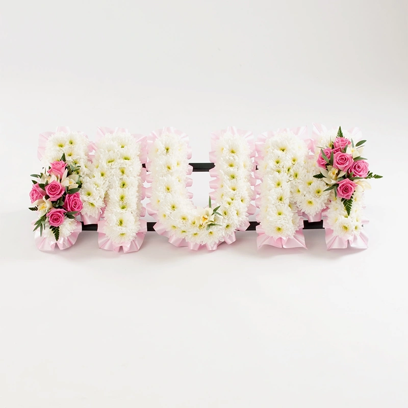 Funeral Flowers for Mum – Letter Tribute A floral tribute spelling "Mum" in fresh seasonal flowers, each letter built on a secure frame. Approximately 3ft across. Two working days to prepare. Delivered directly to funeral homes, churches, crematoriums, and graveside locations. This version uses a single colour throughout rather than a mixed palette — all three letters in one consistent tone. It gives the word a clean, unified appearance that reads clearly during a service and tends to look more considered than a mixed arrangement when only one colour is used. The arrangement Each letter is built individually, then placed together. The flowers cover the frame surface fully, with soft floral sprays worked through for texture and detail. The letters are proportioned to balance across the three characters so "Mum" reads evenly from a distance. Roses, lilies, chrysanthemums, and carnations are the typical flowers. The specific combination depends on what's freshest when your order is prepared. The colour is chosen when ordering and stays consistent across all three letters. Choosing a colour White is the most widely chosen. Clean, dignified, appropriate for any service setting. It works alongside any other tributes without competing and needs no particular explanation. Soft pink is the next most common — a warm, gentle choice that feels personal rather than formal when it reflects something real about her. Bold colours — deep red, bright yellow, strong purple — work when she had a favourite that the family wants to use, or when a quieter palette doesn't feel right for who she was. A vivid colour tribute says something different from a white one, and for some families that directness is the point. If she had a colour she wore often, kept in her garden, or filled the house with — use it. The florists will build around it. Personalisation Specific flowers, a particular shade, ribbons, and name cards can all be incorporated. If there are flowers connected to her — something she grew, something she always had cut in a vase, something the family associates with her — include it in the order and the team will work it in where seasonal availability allows. Other names and tributes If she was known by a different name — Mom, Mother, Ma, or a first name — the tribute can be made in any name. Other relationships are available too: Dad, Nan, Grandad, and custom names and words. The letter count affects the sizing; contact the shop to discuss. Ordering and delivery Two working days from order. Include the full delivery address, service date, and required arrival time when ordering. The team coordinates with venues directly. For urgent orders, contact the shop and the team will tell you clearly what's achievable. FAQ What does the Mum letter tribute look like? Three floral letters spelling "Mum," each built on a secure frame and covered in fresh flowers in a single consistent colour. Approximately 3ft across, proportioned to read clearly at a service from a distance. Why single colour rather than mixed? A single-colour tribute has a cleaner, more cohesive appearance. When the colour is chosen to mean something — a favourite colour, a shade connected to her — it says more than a general mixed arrangement. It's a personal choice rather than a default. What flowers are used? Roses, lilies, chrysanthemums, and carnations with seasonal foliage. The specific combination varies with what's freshest when your order is prepared. Colour and specific flower preferences can be noted when ordering. Can I choose the colour? Yes. White, soft pink, bold or vibrant tones, or a specific colour that meant something to her — note it when ordering. The florists will build the tribute around it where stock allows. Can favourite flowers be included? Yes. Something she grew, something she always had in the house, something the family connects with her. Include it in the order notes and the florists will incorporate it where possible. How much notice is needed? Two working days. For urgent orders, contact the shop directly and the team will advise on what's achievable. Where do you deliver? Funeral homes, churches, crematoriums, and graveside locations. Include the full address, service date, and required arrival time when ordering. The team coordinates with venues directly. Can you make tributes for other names? Yes. Dad, Nan, Grandad, first names, nicknames, or any word. Different letter counts affect the sizing — contact the shop to discuss and the team will advise on what works.