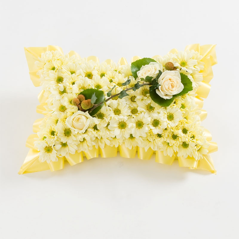 Funeral Pillow Tribute – cream pillow with rose spray The pillow shape in funeral floristry has been in use long enough that it doesn't need explaining. The cushion form — something to rest on — says what it's there to say, and that directness is probably why it persists. Our version takes that traditional base and adds a rose spray across it, which gives the arrangement two things at once: the symbolism of the pillow and the personal specificity of a flower choice. The base is covered in cream flowers — close-headed blooms arranged densely for a soft, cushioned appearance with barely any foam visible. The rose spray sits on top: three to five rose heads with foliage and accent flowers, positioned diagonally, centrally, or at the corner depending on the effect you want. The finished arrangement measures roughly 18 to 20 inches long, 14 to 16 inches wide, and 4 to 6 inches deep. It can be placed beside the casket, at a graveside, or during a home or chapel viewing. The rose spray The rose colour carries most of the personal meaning in this arrangement. Red is chosen most often for a spouse or close family — it's direct and carries its own weight. Pink is warmer and softer, used often for parents, children, or a relationship that mattered deeply without being romantic. White sits quietly against the cream base and reads as peaceful. Yellow suits someone whose connection to the person was built on friendship and warmth. Mixed combinations, or a specific custom shade, are straightforward to accommodate. If a particular rose variety matters — something they grew, or something connected to them personally — mention it when you enquire. We'll include it where it's in season. Ordering and delivery Two working days' notice is needed. The arrangement is made fresh on the day of delivery. We deliver to funeral homes, churches, and graveside. FAQ What makes the pillow-with-spray design different from a standard pillow tribute? A plain pillow tribute is a single-colour arrangement — the cushion base is covered uniformly in one type of flower. A pillow with a rose spray introduces a second element on top of that base, which adds dimension, colour contrast, and a more personal quality to the piece. The rose spray is what you choose — in type, colour, and placement — so the overall arrangement says something specific about the person rather than being a general gesture of respect. What does the pillow shape mean at a funeral service? The cushion form is one of the oldest shapes in British funeral floristry. It evokes rest and peace — the visual language is simple and people understand it immediately. It's chosen when families want a tribute that communicates comfort and calm rather than something more expressive or contemporary. It suits traditional services, and it works particularly well when someone passed after a long illness or at an advanced age, when a feeling of peace is what the family wants to mark. What rose colours are available, and does the choice matter? Red, pink, white, yellow, purple, and mixed combinations are all available. The choice matters in the sense that it adds a layer of personal meaning. Red is most commonly chosen for a spouse or close family member. Pink suits a gentler or less formal relationship. White sits calmly against the cream base. Yellow is chosen for friendships and warmth. If the person had a favourite colour or a flower they were associated with, that's a better guide than convention — tell us when you order. Can the base colour be changed from cream? Yes. White-based pillows are also common. Pastels or richer tones can be specified if there's a particular look you're going for. The cream or white base works well with most rose spray colours because it provides contrast without competing with the spray. If you want something significantly different in tone, mention it when you enquire and we'll discuss what works. Can I add foliage, accent flowers, or a ribbon message? Yes. Foliage and accent flowers can be worked into the rose spray for a more elaborate arrangement. A ribbon with a name or short message can be added — it's a small addition that many families find meaningful. Tell us what you'd like when you order. How big is the arrangement? Roughly 18 to 20 inches long, 14 to 16 inches wide, and 4 to 6 inches deep. Smaller or larger versions can be made on request. If you have a specific placement in mind — a narrow graveside space, for instance, or a particular display table — let us know the constraints and we'll work within them. How much notice do you need? Two working days minimum. The arrangement is made fresh on the day of delivery. If your situation is urgent, contact us directly and we'll tell you what's achievable. Where do you deliver? To funeral homes, churches, and graveside. We coordinate delivery timing to ensure the arrangement arrives fresh and in good condition before the service.