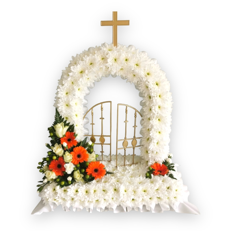 Gates of Heaven Funeral Tribute A freestanding, three-dimensional floral tribute shaped as an open gate, built from fresh seasonal flowers on a structural frame. It stands upright on its own base and has genuine height and depth — it's a different category of tribute from a wreath or flat arrangement. At a service it works as a clear focal point, visible and present throughout. Two working days to prepare. Delivered direct to funeral homes, churches, crematoriums, and graveside locations. The design The gate is constructed as a full three-dimensional form — not a flat representation of a gate but an actual arch with depth and structure. Flowers cover the frame completely, and an arch element is built into the upper portion, often incorporating a cross depending on the family's wishes. The base is weighted for stability so the tribute stands securely throughout the service. Roses, lilies, and chrysanthemums are the typical flowers used, with greenery and ribbons worked through the arrangement. The specific flowers depend on what's in best seasonal condition when your order is prepared. Colour choices, specific flowers, and additional elements can all be noted when ordering. The symbol The gates of heaven image comes from Christian tradition — the passage through a gate into rest and peace. It's one of the more specifically meaningful choices in funeral floristry because the image says something clear rather than leaving meaning open. The open gate in particular carries a sense of welcome and arrival rather than ending — it's about where someone has gone rather than the fact that they've gone. For services that aren't explicitly Christian, the open gate and the arch still carry recognisable meaning around transition, continuation, and spiritual peace. The tribute can be adjusted through flowers and colour to reflect a particular faith tradition more closely if that's important to the family. Colour options Whites and creams — the most traditional choice. Dignified, clean, and sits naturally alongside any other tributes at the service. Soft pastels — pinks, lavenders, warm creams. Gentler in character, suits services with a quieter and more intimate tone. Vibrant colours — bolder, more saturated tones. Some families want the flowers at a service to feel full of life and colour rather than subdued. This tribute has enough structural presence to carry bolder colours without losing its dignity. Personalisation Specific flowers, colour preferences, a name card, a ribbon in a meaningful colour, a cross or other symbol incorporated into the arch — mention anything specific when ordering. The florists work with requests where seasonal availability allows. If the person you're remembering had favourite flowers or colours, or if there's something particular to their faith or their life you want reflected in the tribute, the team will do their best to include it. Ordering and delivery Two working days from order. When ordering, include the full delivery address, the date of the service, and the time the tribute needs to be in place. The team liaises with venues directly. For orders where two working days isn't available, contact the shop — the team will be honest about what's achievable with the time you have. FAQ What does the gates of heaven design mean? It comes from the Christian image of passing through a gate into eternal rest and peace. The open gate specifically represents arrival and welcome rather than closure — a distinction that matters to many families. The design also resonates outside explicitly Christian services, since the arch and open gate carry broader meaning around transition and continuation. What flowers are used? Roses, lilies, and chrysanthemums are the typical base, with seasonal greenery and ribbons worked through. The specific flowers depend on what's freshest when your order is prepared. Colour preferences and specific flower requests are taken into account where availability allows. Can I personalise it? Yes. Colours, specific flowers, name cards, ribbons, and structural elements like a cross can all be incorporated. Include preferences when ordering and the florists will work with them. How large is it? It's a freestanding three-dimensional structure with height and depth — larger and more prominent than a flat wreath or spray. Exact dimensions vary slightly with the flowers used. It's designed to function as a focal point at a service rather than a background element. How much notice is needed? Two working days. For urgent orders, contact the shop directly and the team will advise honestly on what's possible. Where do you deliver? Funeral homes, churches, crematoriums, and graveside locations. Provide the full address, service date, and required arrival time when ordering. The team coordinates with venues to ensure the tribute is in place before the service. Is it suitable for non-Christian services? The design has strong Christian roots but the symbolism of an open gate and arch translates across faiths and traditions. The specific religious elements can be adjusted through flower choice and structural details when ordering to better reflect the person's beliefs or the character of the service. Can it be displayed outdoors? Yes. The freestanding base is designed to be stable for both indoor and graveside display. For outdoor services, let the team know when ordering so the arrangement can be prepared to account for the conditions.
