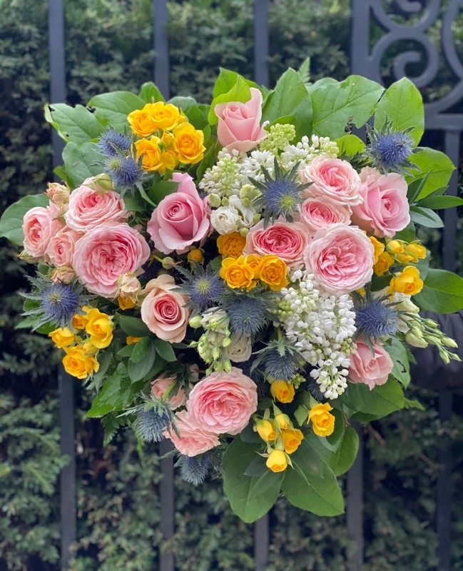 lemon blush – yellow rose bouquet Lemon blush is built on yellow spray roses, which are less common in cut flower arrangements than you might expect. Most bouquets default to pink, red, white, or orange. Yellow reads differently — warm, cheerful, and notably non-romantic, which makes this arrangement useful for a wider range of relationships and occasions than something built around red or blush-pink roses would be. The palette here is yellow, soft pink, and white, with thistle providing an unexpected cool-silver note that stops the whole thing from reading as uniformly sweet. The flowers Yellow spray roses are the anchor — multi-headed stems with several small blooms each, giving the arrangement fullness and a relaxed, gathered quality. Alongside them: pink spray roses and single-headed pink roses, which move the palette warmer and add variety in scale and shape. White lisianthus provides ruffled, pale filler with its own soft texture. White lilac — where it's in season — contributes fragrance and the fine-clustered detail that heavier blooms can't provide. Thistle is silvery, slightly spiky, and architectural; it sits in contrast to the softer flowers around it in a way that makes the whole arrangement more interesting than it would be without it. Seasonal greenery fills the structure throughout. The specific variety depends on what's freshest when your order is made. A note on the lilac: it has a defined season, broadly late spring. Outside that window it may not be available and will be substituted with a comparable white filler — typically waxflower or white veronica — keeping the same general character. If lilac is specifically important to you, call ahead to check availability. Yellow roses and occasion The conventional symbolism of yellow roses is friendship and warmth rather than romance. That's genuinely useful when you're choosing flowers. Red and deep pink roses carry specific associations that can feel awkward in the wrong context — a colleague's birthday, a neighbour who's been helpful, a friend who's been going through something difficult. Yellow avoids all of that and reads as warm and generous without suggesting anything it shouldn't. This is the right arrangement for a friend's birthday, a good colleague leaving a job, a congratulations on a promotion or new home, or a get-well gesture. It's also one of the better workplace gifting options in the range precisely because the palette doesn't read as personal in a way that could land awkwardly in a professional setting. For a romantic occasion, look elsewhere in the range — Pretty in Pink or Orchid Opulence would be more natural fits. Lemon Blush is for when you want to say something warm and generous to someone who isn't a romantic partner. Scent When lilac is in the arrangement, it's fragrant. The lisianthus adds very little scent. Overall this is a lightly scented bouquet — noticeable when you're close but not something that announces itself across a room. For an office or a shared space, that's often a point in its favour. Care and vase life Seven to ten days. Trim the stems at an angle on arrival, use the flower food sachet, change the water every couple of days. Spray roses and lisianthus continue opening over the first day or two — the arrangement fills out as the blooms develop, so give it a bit of time before judging its final form. Keep it away from direct sunlight, radiators, and fruit bowls. Delivery Same-day delivery for orders placed before 2pm. The bouquet is arranged fresh on delivery day. Add any notes — timing, access requirements — at checkout. FAQ What flowers are in Lemon Blush? Yellow spray roses, pink spray roses, pink roses, white lisianthus, thistle, seasonal greenery, and white lilac where it's in season. The yellow spray roses and the thistle are what make this arrangement visually distinct from a standard pink bouquet. Are yellow roses suitable for occasions that aren't romantic? That's actually the main reason to choose them. Yellow roses aren't associated with romantic love the way red or deep pink ones are — they read as warm, cheerful, and friendly in a broader sense. This makes Lemon Blush useful for friends, colleagues, families, and professional relationships where something more romantic-coded would feel off. If you need flowers for a romantic occasion, it's worth looking at other arrangements in the range. Is the lilac always available? No — lilac has a season, broadly late spring. Outside that period it will be substituted with a comparable white filler flower (often waxflower or white veronica) that keeps the same overall feel. If the lilac is specifically important, call ahead to confirm before ordering. Does the bouquet have a scent? Lightly, yes — mostly from the lilac when it's in season, with the lisianthus adding very little. It's gentle enough for a shared space or an office without being noticeable from across the room. How long will it last? Seven to ten days with basic care. Trim the stems, use the flower food, change the water every couple of days. The spray roses and lisianthus continue opening over the first day or two, so the arrangement develops a bit after delivery. Is this a good choice for a colleague or work gift? Yes — it's one of the better options for that. The yellow palette is cheerful and warm without carrying romantic associations, which makes it easier to send in a professional context. It reads as genuinely considered rather than like a generic mixed bunch. Can I customise the arrangement? Within the yellow and pink palette, yes. Leave a note at checkout or call ahead if you want to adjust the colour balance or have a specific preference. The florists will work with what's in season. Is same-day delivery available? Yes, for orders placed before 2pm. The bouquet is arranged fresh on the day of delivery.