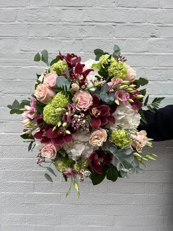 orchid opulence – luxury orchid bouquet The pink cymbidium orchids are what make this arrangement. They're not a supporting detail — they're the reason to choose this over anything else in the range. Cymbidium blooms are waxy, structured, and long-lasting in a way that most cut flowers simply aren't, and pink ones carry a warmth that the more architectural white or green varieties don't. Arranged with white roses, pink spray roses, white lisianthus, and eucalyptus, the overall effect is generous and considered — a bouquet that looks expensive in the genuine sense of the word, not the inflated one. The palette is white, blush pink, and silver-green. It runs warm and feminine, similar in register to Pretty in Pink but with more visual presence and a longer lifespan thanks to the orchids. The flowers Pink cymbidium orchids grow on arching stems with multiple blooms per spray, each one a smooth, open face with a contrasting lip. They hold their structure for two to three weeks as cut flowers — the rest of the arrangement will change before they do. White roses provide the full, petalled volume at the centre. Pink spray roses are multi-headed and smaller, filling in the body of the arrangement without repeating the same shape as the larger roses. White lisianthus has a ruffled, poppy-like quality — it softens the silhouette and contributes some additional white. Eucalyptus ties the arrangement together at the stems and adds a faint cool scent. The lisianthus may arrive partially open and continue developing over the first couple of days. The orchids should arrive in good shape and will stay that way for considerably longer. Longevity This is the arrangement to choose if you want flowers that last. With basic care — fresh water every couple of days, away from direct sunlight and heat — the full arrangement holds well for ten to fourteen days. The orchids specifically can last two to three weeks. If you're gifting to someone who travels or isn't always home to tend to flowers, or if you want a display for an event that needs to look good over an extended period, the orchid-based arrangements hold up better than most. When it works For anniversaries and significant occasions, the combination of roses and orchids has real presence without being obvious. It suits people who appreciate that the orchids mean something different and longer-lasting than a standard rose arrangement, and it reads as genuinely considered rather than reaching for a familiar formula. For corporate gifting and professional occasions, this is one of the stronger choices — it's not gendered in an obvious way, the palette is sophisticated without being cold, and the longevity means it'll be visible on a desk or in a reception space for a long time. It makes an impression that outlasts the delivery day. For luxury weddings, milestone birthdays, promotions, and significant achievements, it provides the visual weight and longevity that those occasions call for. For a wedding specifically, contact us before ordering through standard checkout if you need multiple arrangements. As a home display, the long vase life is especially relevant. A fortnight is a meaningful amount of time for a centrepiece. How it compares in the range If you've looked at the Lime Twist bouquet, both feature cymbidium orchids. The difference is in colour and register: Lime Twist uses green orchids in a white and green palette — cool, contemporary, more minimal in feeling. Orchid Opulence uses pink orchids in a warm blush palette — it reads as romantic and generous rather than architectural. Same longevity advantage, different mood entirely. Delivery Same-day delivery for orders placed before 2pm. Arranged fresh on delivery day with premium presentation wrapping. If specific flowers aren't available, substitutions keep the white and pink palette and the same overall quality level. FAQ What flowers are included? Pink cymbidium orchids, white roses, pink spray roses, white lisianthus, and eucalyptus. The orchids are the distinctive element — waxy, structured blooms on arching sprays that outlast everything else in the arrangement by a significant margin. How long will this bouquet last? Ten to fourteen days overall with proper care. The cymbidium orchids specifically hold well for two to three weeks — they'll still be in good shape after the roses have finished. This is the longest-lasting cut flower arrangement in the range, which is worth factoring in if you're choosing between this and a standard bouquet. What makes cymbidium orchids different from other flowers? They're cut from a naturally long-lived plant, and the blooms hold their structure unusually well once cut. Where most flowers soften and drop petals within a week, cymbidium blooms stay firm and open for two weeks or more. The trade-off is that they're less flexible than softer flowers and can mark if handled roughly. Is same-day delivery available? Yes, for orders placed before 2pm. The arrangement is made fresh on delivery day. Is this suitable for a corporate gift? Yes — it's one of the better options for professional gifting. The palette doesn't read as overly personal or romantic, and the longevity means it'll be visible in an office or meeting room for a genuine amount of time. It makes a proportionate impression for a significant occasion. How does this compare to Pretty in Pink? Both are warm pink-and-white arrangements. Pretty in Pink has more ranunculus and calla lilies — it's softer in outline and suits romantic or celebratory occasions. Orchid Opulence is more structured, with greater visual presence and a much longer vase life. If longevity and impact matter more than softness, this is the better choice. Can I customise the bouquet? Within the white and pink palette, yes. Get in touch before ordering if you have a specific preference and we'll see what's possible. What care does this need? Trim the stems at an angle on arrival, use the enclosed flower food 