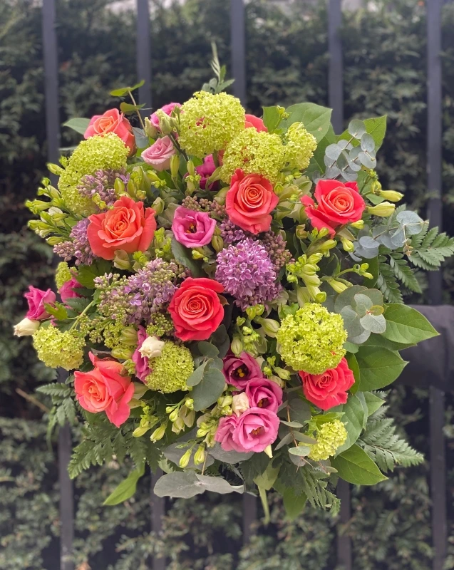 miss piggie – peachy-pink rose bouquet Miss Piggie is the rose that keeps appearing as a supporting flower in other arrangements in the range — it's in Wild Thing, in Sunset Cerise. Here it's the main event. The variety has a distinctive colour: a warm coral-pink that reads peachy rather than blush, more vivid than soft pink without crossing into hot pink. It's a good-looking rose, and it works well as the centrepiece of an arrangement built around warm and purple tones. The bouquet combines Miss Piggie roses with soft purple lilac, white alstroemeria, pink lisianthus, green viburnum, and eucalyptus. The result is warm, slightly lavender-touched, and more interesting in its palette than a standard pink arrangement. The flowers Miss Piggie roses are a named cultivar, not a generic pink rose — they have a distinctive peachy-coral depth to the petals and hold well in the vase. The lilac brings the purple tones and the fragrance; eucalyptus adds a secondary scent underneath it. White alstroemeria are multi-flowered stems that fill in the body of the arrangement and last well — they're one of the more persistent cut flowers and keep the bouquet looking full as the week goes on. Pink lisianthus echoes the rose colour in a softer, ruffled form. Viburnum clusters provide pale green texture throughout. The scent is pleasant and genuine — lilac and eucalyptus together produce a real fragrance, not a subtle background note. In a smaller room it'll be quite present; in a large living space it's more ambient. That's worth knowing before sending this to someone in a small flat or a shared workspace. A note on the lilac: it has a defined season in late spring. Outside that window it won't be available, and we'll substitute with a comparable purple or white filler flower while keeping the same palette and character. If the lilac is specifically important, call ahead to check availability before ordering. The colour palette Peachy-coral, soft purple, pink, and green don't appear together in many arrangements, which is part of what makes this bouquet look distinct on a shelf or in a room. The purple of the lilac works against the warm peach of the roses in a way that both separate them clearly and make each read more strongly. It's a confident combination for people who like their flowers to have some complexity. When it works Birthdays are the most natural fit — the bouquet is warm and celebratory without the slightly formal register of an all-rose arrangement. The peachy-pink palette suits a broad range of people without being obviously gendered, which makes it useful when you're not entirely sure of the recipient's taste. For Mother's Day, anniversaries, and thank-you gifts, the Miss Piggie variety specifically suits — its coral warmth reads as affectionate and personal. For Valentine's Day, it works as a romantic gesture if the relationship is warm and familiar rather than brand new. Bridal showers and hen parties suit this arrangement's energy well. For a wedding itself, contact us to discuss quantities if you need multiple arrangements. For sympathy, this isn't the right choice — the warmth and personality of the palette is better suited to celebration. Care Seven to ten days. Trim the stems at an angle when the bouquet arrives, use the flower food sachet, change the water every couple of days, and keep it out of direct sun and away from heat. The alstroemeria will keep going longer than most other flowers in the arrangement; if you want to extend the display, they're worth fresh water and a separate vase once the roses start to fade. Same-day delivery for orders placed before 2pm. The bouquet is arranged fresh on delivery day with presentation wrapping included. FAQ What flowers are in the Miss Piggie bouquet? Miss Piggie roses, soft purple lilac, white alstroemeria, pink lisianthus, viburnum, and eucalyptus. The Miss Piggie roses and lilac set the colour register; the alstroemeria and lisianthus fill the arrangement and add variety in shape; viburnum provides texture throughout. What colour are Miss Piggie roses? Peachy-coral — warmer and deeper than blush pink, not as vivid as cerise or hot pink. The name tends to surprise people who haven't seen them before. They're a distinctive variety that reads differently from a standard cut rose. Is the lilac always available? No. Lilac has a natural season in late spring, and outside that window it may be unavailable. We'll substitute with a comparable purple or white flower that keeps the same feel and palette. If purple lilac specifically matters, call ahead before ordering to confirm availability. Is this bouquet scented? Yes, noticeably so — lilac and eucalyptus together produce a real fragrance. In a smaller enclosed space it'll fill the room; in a larger space it's more background. Worth bearing in mind if the recipient is sensitive to strong floral scent or if it's going to a shared workspace. How long will it last? Seven to ten days with basic care. The alstroemeria generally outlasts most of the other stems — it's one of the longer-lasting cut flowers and will keep the arrangement looking full well into the second week if you refresh the water regularly. What occasions is it best suited for? Birthdays, Mother's Day, thank-you gifts, anniversaries where a warm rather than formally romantic gesture is appropriate, and bridal showers. It's not the right choice for sympathy or condolences — the warmth and personality of the palette suits celebration. Can I get same-day delivery? Yes, for orders placed before 2pm. The bouquet is arranged fresh on delivery day. How does this compare to Sunset Cerise or Pretty in Pink? Both of those sit in warmer pink territory. Sunset Cerise is the most vivid of the three — cerise and hot pink in a sunset palette. Pretty in Pink is softer in blush and pale pink. Miss Piggie sits in the middle: warmer than Pretty in Pink, less intense than Sunset Cerise, and distinguished by both the specific c