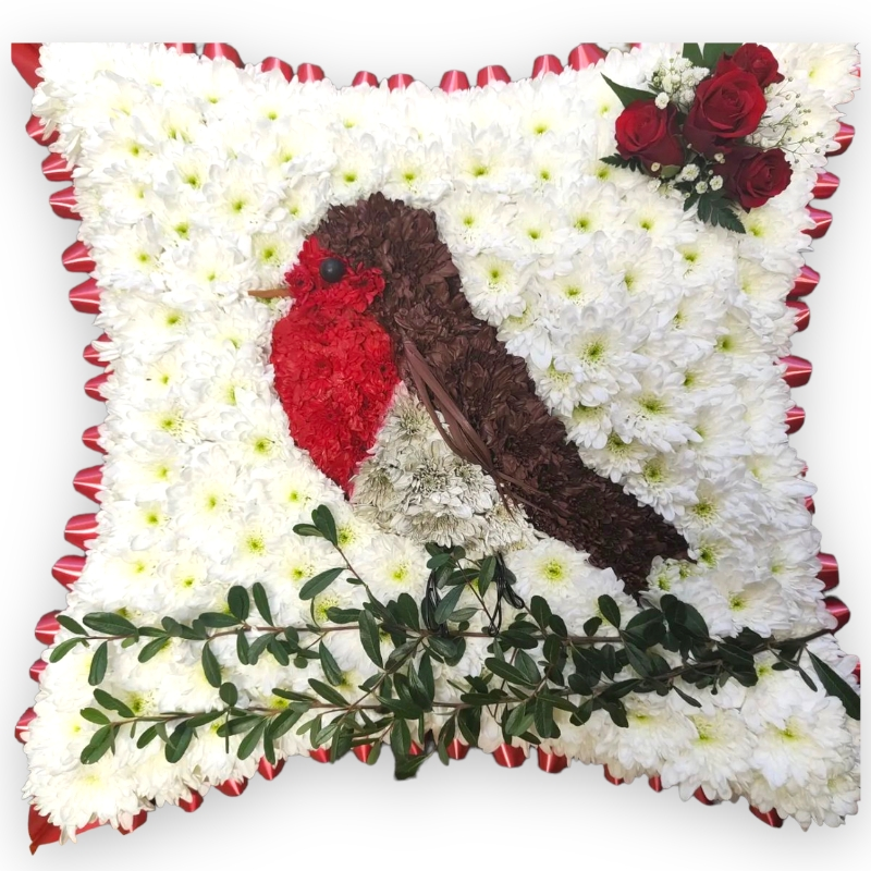 Robin Pillow Funeral Tribute A floral pillow tribute with a robin motif, made from fresh seasonal flowers set into floral foam. Available in two sizes: 13 x 19" (33cm x 48cm) or 14 x 21" (35cm x 53cm). Comes with a stand for flat or upright display. Two working days to prepare from order. The robin For many families, robins carry a specific meaning around loss — the idea that a robin near the home or grave is a sign of a loved one's presence. It's a belief that runs deep in British culture, and for families who hold it, a robin tribute isn't just a shaped arrangement. It's saying something particular. For families who don't hold that belief, the robin still works as a symbol associated with warmth, the turning of seasons, and things that endure. Either way, it's a more personal choice than a standard wreath or spray, and that's usually why people choose it. The arrangement Fresh seasonal flowers — typically roses, carnations, chrysanthemums, and lilies — are set into floral foam shaped as a pillow. The robin is formed within the flower surface. The arrangement holds its shape and condition through the service. The specific flowers depend on what's freshest when your order is prepared. Colour options Soft pastels — pinks, lavenders, creams. Gentle and quiet, suited to services that are reflective in tone. Whites and creams — traditional and clean. Works alongside any other tributes without competing. Vibrant colours — bolder tones for someone whose character called for colour, or for a service that's meant to feel celebratory rather than subdued. If the person had favourite flowers, colours, or anything specific you want included — a ribbon, a name card — mention it when ordering. The florists will include it where availability allows. Sizes The 13 x 19" suits most service settings and graveside use. The 14 x 21" has more visual presence and works well as a centrepiece or standing display at a larger service. Both come with a stand. Ordering and delivery Two working days to prepare. When ordering, include the full delivery address, the service date, and what time the tribute needs to be in place. The team coordinates with funeral homes, churches, crematoriums, and graveside locations directly to ensure timely arrival. For urgent orders, contact the shop — the team will tell you honestly what's achievable with the time available. FAQ What does the robin mean as a funeral tribute? The robin is associated with the belief that departed loved ones remain close — a deeply held tradition for many families in the UK. It also carries broader associations with warmth and the turning of seasons. For some families the meaning is spiritual; for others it's personal to the person they've lost. Both are valid reasons to choose it. What flowers are used? Seasonal flowers — typically roses, carnations, chrysanthemums, and lilies — chosen for freshness and condition at the time of preparation. The specific mix varies. Colour preferences and specific flowers can be requested when ordering. Can I personalise it? Yes. Colour palette, specific flowers, name cards, and ribbons can all be incorporated. Include your preferences when ordering and the florists will work with them where stock allows. What sizes are available? 13 x 19" (33cm x 48cm) and 14 x 21" (35cm x 53cm). Both come with a stand for flat or upright display. How much notice is needed? Two working days. For urgent orders, contact the shop directly and the team will advise on what's possible. Where do you deliver? Funeral homes, churches, crematoriums, graveside locations, and family homes. Provide the full address, service date, and required arrival time when ordering. The team liaises with venues directly where needed. Can it be displayed upright? Yes. The included stand allows both flat and upright display, depending on where it's placed at the service. Is it suitable for a graveside tribute? Yes. The smaller size is well suited to graveside use. The floral foam keeps the arrangement stable and maintains its appearance through an outdoor service.