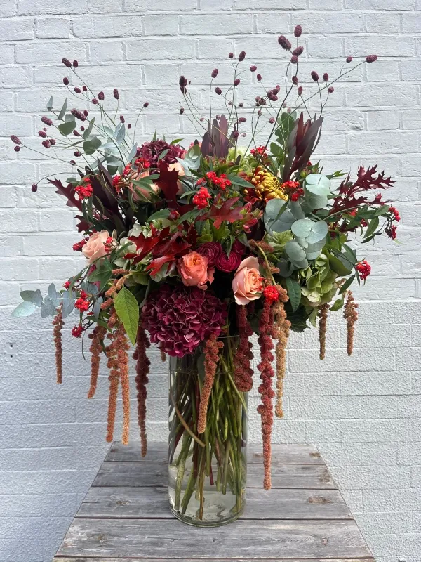 Rustic Vase Arrangement Burnt orange, deep burgundy, and soft blush tones with foliage and textural elements arranged in a clear glass vase. It arrives ready to place — vase included, fully arranged, nothing to do when it gets there. The arrangement is built to look abundant and layered. Foliage and natural accents are worked through the blooms rather than sitting at the edges, and the stem heights vary to give the whole thing movement and depth. The clear glass vase means the stems and structure are visible from the base — it suits the natural aesthetic better than a ceramic or opaque vase would. The palette Burnt orange and deep burgundy are the main colours. Warm, rich, and substantial without being heavy. Soft blush is the third element — it lifts the arrangement and gives it some variation so the darker tones don't flatten everything out. Foliage and textural accents — seed heads, eucalyptus, dried grasses, branching stems — vary by season and by what's available. In autumn the options are strongest; the rest of the year the florists work with whatever carries the palette well. These elements last longer than the fresh flowers and often continue looking good after the blooms have been removed. The specific flowers change week to week based on what's in best condition at market. The colour register is consistent. The blooms in your arrangement won't necessarily match the photo exactly — the image is a reference for palette and style, not a fixed product description. Where it works best Dining tables are the most natural use — a centrepiece at this scale and in these colours suits autumn and winter evenings well, both for occasions and just for the room's general feel during the season. A sideboard, hallway console, or mantelpiece all work. It suits rooms with some existing warmth — wooden furniture, warm-toned walls, natural textiles. In a very spare or cool-toned interior the palette can feel out of place. In a room with texture and depth already present, it fits without needing to fight for its position. As a gift it works well for autumn hosting — for a dinner party, a housewarming during the season, or a thank-you for someone who puts effort into their home. It also makes sense as a self-purchase for seasonal decorating. It arrives arranged and ready with nothing to assemble or figure out. Personalisation More orange, more blush, specific foliage or seasonal accents you'd like included — note preferences when ordering. Because arrangements are made fresh from available stock, specific flowers can't be guaranteed, but the florists work stated preferences into the finished piece where stock allows. Delivery Home, office, or direct to a recipient, fully arranged in the glass vase. One to two working days to source and prepare. Contact the shop directly for urgent orders. Care Trim the stems at a 45-degree angle when the arrangement arrives and place in clean water. Change the water every two to three days and remove any leaves below the waterline. Keep away from direct sun, radiators, and fruit. The dried and textural elements don't need water — they'll outlast the fresh flowers considerably. Remove fresh blooms as they go off and the foliage and structural elements will often keep looking good for weeks beyond the last flower. FAQ What colours are in the arrangement? Burnt orange, deep burgundy, and soft blush tones with seasonal foliage and textural accents. The palette is consistent between orders; the specific flowers and foliage vary by season and availability. What flowers are included? Seasonal and variable — the florists choose from what's in best condition on the day. The colour register stays consistent but the specific blooms won't always match the product images. Does it come with a vase? Yes. It arrives arranged in a clear glass vase, ready to display. Can I request specific colours or flowers? Yes — note preferences when ordering. The florists will work with them where stock allows. Specific flowers can't be guaranteed since arrangements are made fresh daily, but stated preferences are generally reflected. How long does delivery take? One to two working days. Contact the shop directly for urgent needs. How long will it last? Fresh flowers typically seven to ten days with clean water and reasonable care. Dried and textural elements — seed heads, grasses, foliage — will last considerably longer. Remove fresh blooms as they fade and the structural elements often continue looking good for weeks. Is it suitable as a gift? Yes. It arrives ready to give — fully arranged, vase included. A message card can be added at checkout. What occasions is it best for? Autumn entertaining, seasonal home decorating, dinner party gifts, housewarmings during the cooler months. It also works for birthdays and general gifting in the autumn and winter season where the warm palette fits the time of year.