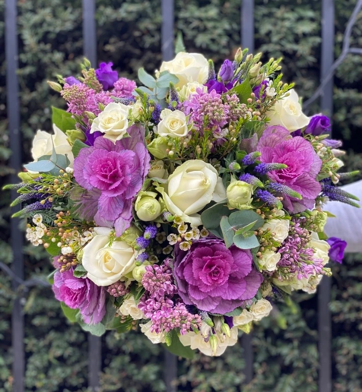 amethyst – purple and white bouquet The Amethyst bouquet is built around a colour combination that doesn't appear much in the standard florist range. Purple and white together read as cool, slightly formal, and genuinely sophisticated — less obviously romantic than pink, less neutral than straight white. If you find most arrangements lean too warm or too safe, this is a reasonable answer to that. The palette is anchored by creamy white roses and touched through with lavender veronica, white spray roses, white wax flower, and purple lilac where it's available. The element that makes the arrangement distinctive, though, is the purple brassica. A word on the brassica Brassica in a bouquet usually prompts a double take the first time you see it. It's ornamental cabbage — a tight, rosette-form head in deep purple-green, with layers that look almost architectural. It's not a conventional cut flower, and that's exactly why it works here. It gives the Amethyst bouquet a texture and visual weight that no rose or filler flower could provide, and it sits surprisingly well against the softer elements around it. It also lasts well in the vase — longer than most flowers in the arrangement. If you want a purple-and-white bouquet that looks like something you'd put together yourself from a supermarket aisle, this isn't it. The brassica makes sure of that. The rest of the flowers White roses form the familiar, full-petalled centre. White spray roses add smaller multi-headed volume around them. Veronica provides slim, upright spikes in soft lavender that break up the round shapes and add height. White wax flower threads through as fine filler — small clusters of it throughout. Purple lilac, in season, brings the deepest purple tone and the most notable fragrance. The lilac is seasonal — late spring primarily. Outside that window it won't be available and we'll substitute with a comparable purple filler flower (typically purple veronica in greater abundance or lisianthus) while keeping the palette consistent. Call ahead if the lilac matters specifically to you. Scent When lilac is present, this bouquet is noticeably fragrant. That's a feature in a home or a large room; worth knowing if it's going to a shared office or somewhere with limited ventilation. The wax flower contributes a faint secondary scent of its own. Without the lilac, the fragrance is much lighter — the roses have a gentle note but nothing intense. What it suits Weddings are a natural fit, particularly for ceremony styles that lean toward cool, considered palettes rather than warm or meadow-inspired arrangements. The purple and white works well in formal ceremony spaces and photographs cleanly on white or grey backgrounds. For sympathy and condolence arrangements, the cool palette is appropriate — not stark the way pure white can feel, but composed and dignified. The brassica specifically adds presence without adding the warmth that might feel mismatched for those occasions. For anniversaries and romantic gestures, it suits couples with a shared aesthetic sensibility that runs slightly unconventional — people who'd find an all-rose bouquet predictable but would appreciate something with more visual interest. It's not a first-date choice; it's a five-year-anniversary choice. For home décor and gifting, it works well in cooler, more minimal interiors. Against a white or grey wall, an Amethyst bouquet has real presence. Care Seven to ten days with standard care. Trim the stems when it arrives, use the flower food sachet, change the water every couple of days, and keep it away from heat and direct sunlight. The brassica is robust and will hold well; the roses and veronica are standard vase life. Same-day delivery for orders placed before 2pm, arranged fresh on delivery day. FAQ What flowers are in the Amethyst bouquet? White roses, white spray roses, lavender veronica, white wax flower, purple brassica, and purple lilac where it's in season. The brassica is the unusual element — it's ornamental cabbage, with a tight rosette head in deep purple-green. It's what makes this arrangement look different from any standard purple-and-white arrangement. What is the purple brassica? Ornamental cabbage — a leafy, rosette-form head used as a cut flower. It sounds unconventional and it is, deliberately. It adds texture, visual weight, and depth that a conventional filler flower couldn't. It also lasts very well in the vase, often longer than the blooms around it. Is the lilac always available? No. Lilac has a defined season, broadly late spring. Outside that period we'll substitute with a comparable purple flower while keeping the overall palette consistent. If lilac is specifically important, call ahead before ordering to check what's available. Is this bouquet scented? Noticeably so when the lilac is in season — lilac has a genuine, room-filling fragrance. The wax flower adds a lighter secondary scent. Without the lilac, the fragrance is much more subtle. Worth considering if you're sending this to someone in a small space or who is sensitive to strong floral scent. Is this suitable for a wedding? Yes — the cool purple and white palette suits formal ceremony spaces and works particularly well in venues with stone, grey, or neutral interiors. If you need multiple arrangements or a bridal bouquet, contact us before placing an order through standard checkout. Is it appropriate for sympathy? Yes. The cool, composed palette is appropriate for those occasions — it's more interesting than a plain white arrangement but doesn't carry the warmth or celebration register that would feel out of place. Add a message card note at checkout. How long will it last? Seven to ten days. The brassica typically holds the longest; the roses and veronica follow standard vase life. Trim the stems on arrival, use the flower food, and keep the water fresh. Can I get same-day delivery? Yes, for orders placed before 2pm. The bouquet is made fresh on the de