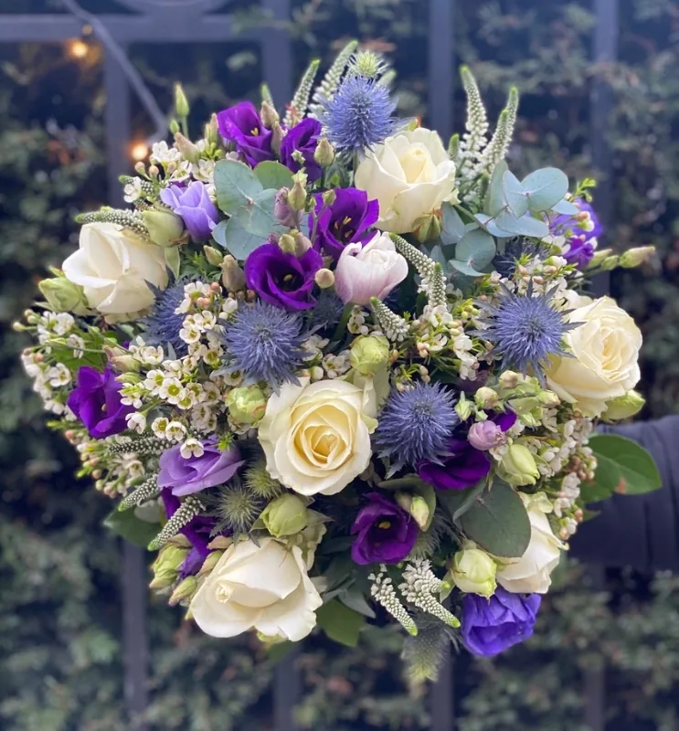 winter garden – winter flower bouquet Winter Garden doesn't look like most bouquets. The palette runs cool and muted — soft whites, pale purple, and the silvery blue-grey of thistle running through the whole arrangement, with winter greens making up the framework. There's nothing warm or summery about it. That's the point. It's an arrangement that makes sense in winter in a way that a bright mixed bunch wouldn't, and it suits that season better precisely because it's not trying to fight it. The scent is gentle. Freesia is lightly sweet, and winter foliage contributes its own quiet fragrance. This isn't a bouquet that fills a hallway — it rewards being in a room with it rather than announced from a distance. The flowers Wax flower is the lightest element: tiny, clustered blooms on fine delicate stems that give the arrangement its texture without adding visual weight. Freesia are more substantial — tubular flowers in small clusters — and carry the scent. Spray roses are multi-headed and compact, adding a little warmth to the otherwise cool palette. The thistle is what makes this arrangement genuinely distinctive: silvery, slightly spiky, architectural. It doesn't look like anything else in the bouquet and pulls the whole colour composition into something more considered. Lisianthus provides larger, poppy-like blooms in pale purple or white, filling the mid-section and giving the arrangement its volume. Seasonal winter greens complete the structure. The freesia and lisianthus will continue opening over the first couple of days after delivery. The arrangement looks different on day three than on day one — the blooms more fully revealed, the fragrance slightly more present. Give it time. What it suits Winter weddings are the most fitting occasion. The palette works naturally in ceremony spaces that lean traditional — a church, a country house, an old stone barn. The thistle in particular has an English and Scottish countryside quality that suits those venues, and the spray roses and lisianthus provide softer, more bridal elements around it. If you're considering this for a winter wedding, contact us before ordering through checkout so we can discuss quantities properly. For Christmas and New Year gifting, this is a more considered choice than a generic seasonal arrangement. The colours sit alongside winter interiors without competing — deep greens, silver-grey accents — and freesia has an association with winter that summer flowers simply don't have. For sympathy, the muted palette handles the occasion well. The thistle adds something more substantial than an all-soft arrangement would, and white lisianthus in particular reads as composed and gentle rather than stark. Birthdays, housewarmings, and winter anniversaries all work. Whether it suits the person you're sending it to depends partly on whether they appreciate a cooler, more understated aesthetic — if they tend towards bright florals, something from the other end of the range might land better. Care Seven to ten days. When the bouquet arrives, trim the stems at an angle, use the flower food sachet, and remove any leaves sitting below the waterline. Change the water every couple of days. Keep it away from direct sunlight and heat sources — central heating dries cut flowers quickly in winter, so position it somewhere cooler if you can. Delivery Same-day delivery for orders placed before 2pm. Arranged fresh on the day of delivery, with premium wrapping. Specific flowers may be substituted depending on seasonal availability while keeping the same cool winter palette. Include any delivery instructions at checkout. FAQ What flowers are included? Wax flower, freesia, spray roses, thistle, lisianthus, and seasonal winter greens. The thistle and lisianthus are the most visually distinctive elements — between them they're what gives this arrangement its particular palette and character. What colour is the bouquet? Soft whites, muted purples, and the silvery blue-grey of the thistle, with winter green foliage throughout. It's a cooler arrangement — deliberately so. It sits alongside winter interiors naturally rather than contrasting with them. Is it scented? Lightly. Freesia has a gentle sweet scent; the winter greens add their own quiet fragrance. It's a subtle arrangement, not an intensely fragrant one. If strong scent is important, Arctic Charm with its oriental lilies and stocks would be a better fit. Will all the flowers be open on delivery? Not fully. Freesia and lisianthus in particular may arrive partially open and continue developing over one to two days. This is normal — the arrangement tends to look its best around day two or three once everything has had time to open. How long will it last? Seven to ten days with basic care. Spray roses and wax flower are generally the longest-lasting elements. Change the water every couple of days and keep the arrangement away from radiators — winter central heating shortens vase life more than most people expect. Is this suitable for a winter wedding? Yes. The palette suits traditional winter ceremony venues particularly well — the thistle has an inherent quality that reads as seasonal and considered rather than generic. If you need multiple arrangements or a bridal bouquet, get in touch before ordering rather than going through standard checkout. Is it appropriate for sympathy or a funeral? Yes. The muted colours handle the occasion with dignity — it's not sparse, but it's not demonstratively bright either. The arrangement reads as composed and thoughtful. Add a message card at checkout. Can I order for same-day delivery? Yes, for orders placed before 2pm. The bouquet is made fresh on the delivery day. Include any specific delivery notes — timing requirements, access details — in the order notes at checkout.